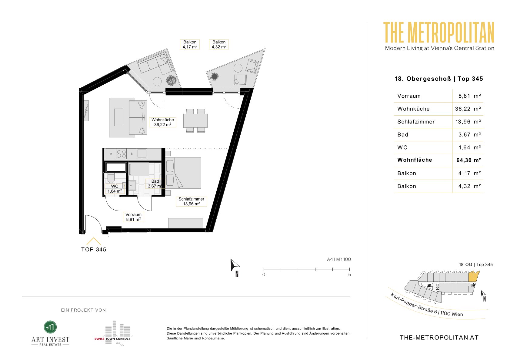 Welcome to “The Metropolitan”, your new urban retreat in the heart of the city! This ultra-modern residential building sets new standards in terms of design, comfort and sustainability. With 370 residential units, a shared roof terrace with fabulous panoramic views, a modern fitness area, a co-working lounge and much more, The Metropolitan offers unparalleled living quality for discerning city dwellers without leaving anything to be desired. Highlights: - panoramic roof terrace on the 19th floor with breathtaking views over Vienna's skyline - spacious fitness area with new Technogym equipment and direct access to the adjoining play and sports terrace on the first floor - stylish coworking lounge on the 2nd floor for homeoffice, meetings or your creative projects - 378 indoor & outdoor bicycle storage rooms including toolbox - 110 in-house underground parking spaces and storage rooms in the basement can be rented - klima:aktiv “silver” certification for sustainability - modern entrance foyer including practical parcel box systems
