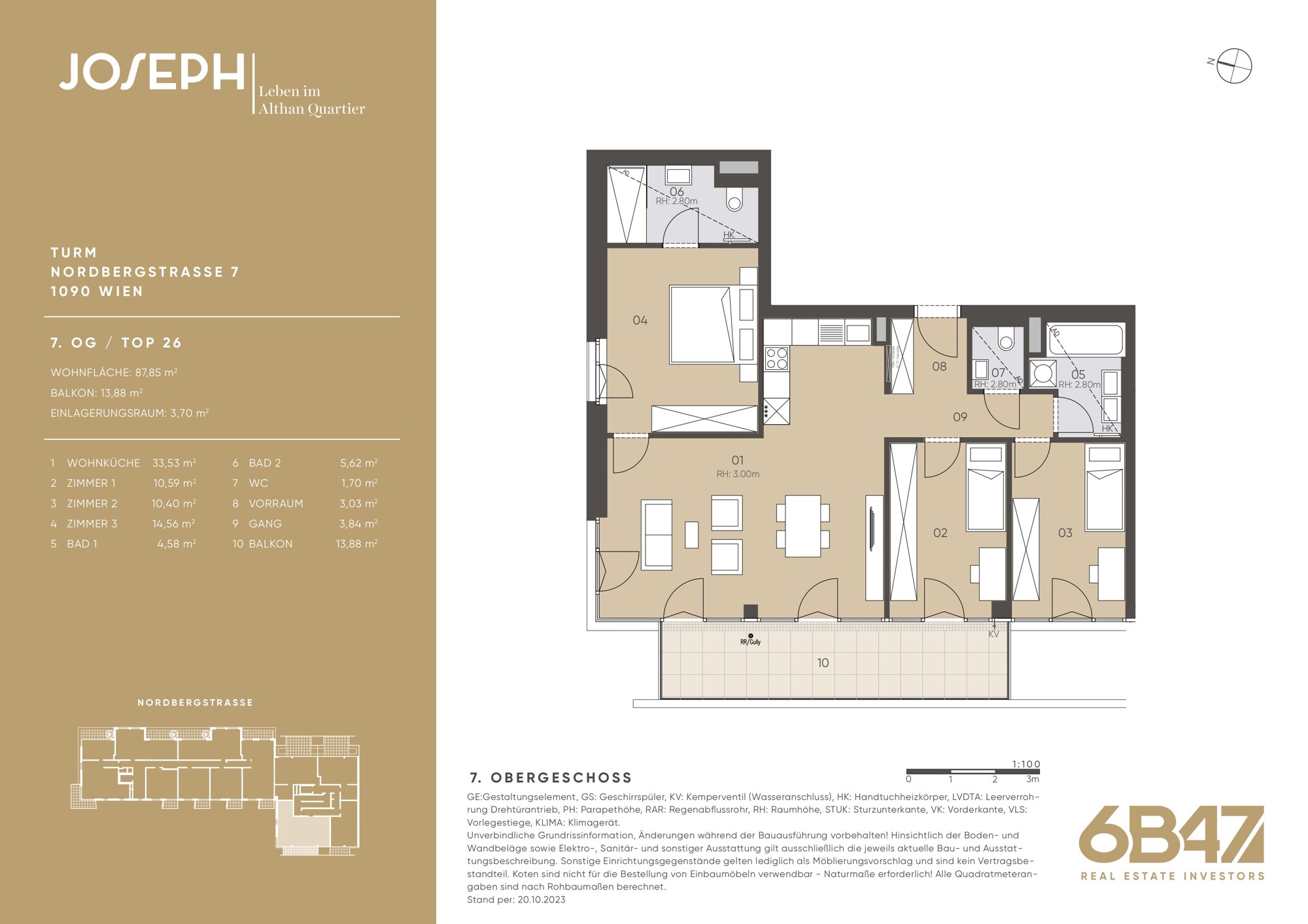 Grab one of these coveted apartments and experience unique living comfort in a very special city location. The 107 superbly equipped units all have a loggia, balcony, or terrace—perfect for enjoying the sun! There really is something for everyone here—from small apartments and smart shared apartment layouts to exclusive penthouses on the top floor with private roof terraces and breathtaking views of Vienna—your requirements will definitely be met here. Highlights: - 107 residential units spread over 2 elegant staircases: Staircase 1 (“Riegel”) at Nordbergstraße 9 with 8 floors & Staircase 2 (“Turm”) at Nordbergstraße 7 with 12 floors, each with elevator - 1 to 5 rooms ranging from approx. 32 to 113 m², each with outdoor space - 13 ground-level garage parking spaces, including equipment for e-charging stations that you can retrofit - high-quality kitchen equipment and stylish, modern bathrooms - light-flooded rooms, high-quality materials, and an open, airy feel - storage room or lockable bicycle parking space for each apartment plus bicycle repair room - many goodies included: communal terrace, air-conditioned fitness room, shared office space, communal room with kitchen, laundry room, parcel boxes, Althan Quartier service app, playgrounds for toddlers, children, and teenagers - excellent transport links via the U4 station “Friedensbrücke” and Franz-Josefs-Bahnhof - ÖGNI Gold pre-certification for sustainability