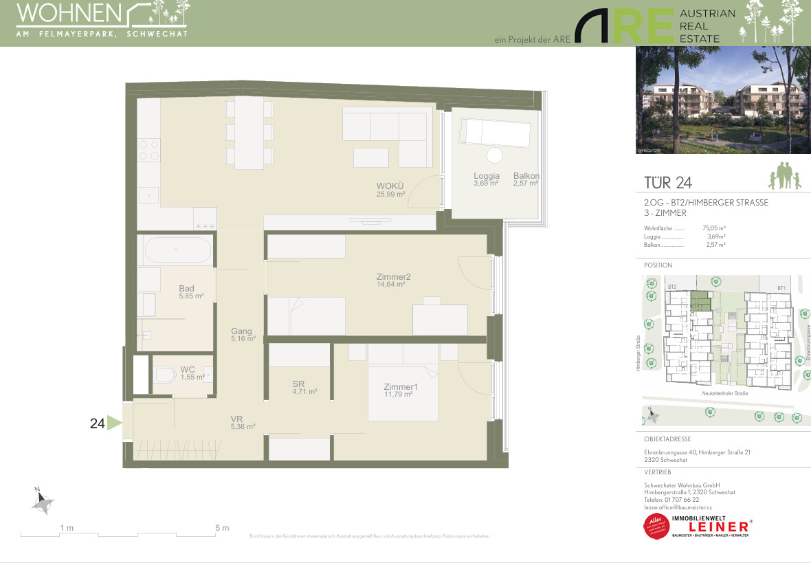 Felmayerpark: Grün, heimisch und preiswert – nur einen Katzensprung von Wien entfernt! 80 Wohnungen, 100% Spaß, ein Katzensprung von Wien entfernt – bezahlbares Wohnen im erstklassigen Neubau. Entdecke eine exklusive Wohnanlage, aufgeteilt in zwei moderne Stiegen: eine zur Ehrenbrunngasse 40, die andere zur Himberger Straße 21. Verbindend ist ein ruhiger Innenhof, der nicht nur Entspannung bietet, sondern auch einen einzigartigen Blick auf den Fehlmayerpark. Vielfältige Wohnungssgrößen (40-117 m2) garantieren für jeden Bedarf die passende Lösung. Highlights: - Direkte Nachbarschaft zum idyllischen Felmayergarten - Nahe der Wiener Stadtgrenze gelegen - 80 Mietwohnungen in zwei ansprechend gestalteten Gebäuden - Kinderspielplatz und Fahrradabstellplätze für familienfreundliches Wohnen - Jede Wohneinheit verfügt über private Freiflächen - 123 Stellplätze in der Tiefgarage - Nachhaltige Bauweise mit extensiver Dachbegrünung
