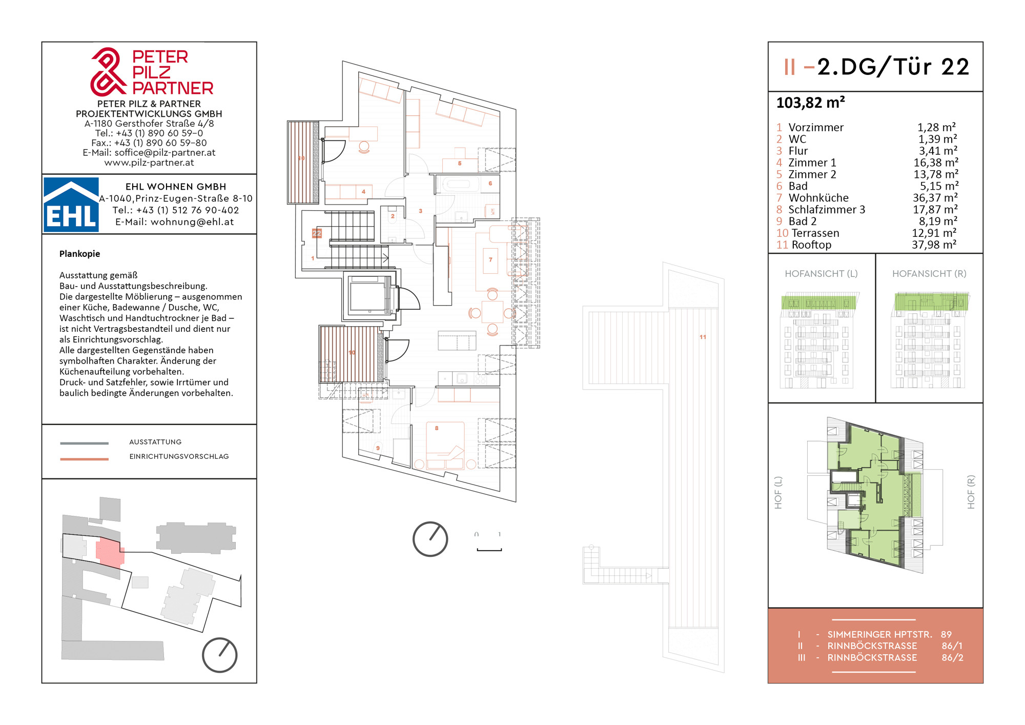 Das Wohnhaus ist auf drei Blöcke aufgeteilt und durch einen Innenhof verbunden. Das Wohnprojekt ist sowohl über die Simmeringer Hauptstraße 89 als auch über die Rinnböckstraße 86 begehbar. Alle Wohnungen haben einen funktionalen Grundriss und verfügen über eine Außenfläche. Eine moderne Einbauküche inkl. aller wichtigen Geräte ist in jeder Wohnung verbaut. Das Wohnhaus ist an die Fernwärme angeschlossen. In den Einheiten ist eine Fußbodenheizung verbaut. Zudem gibt es Fahrrad- und Kinderwagenabstellräume.